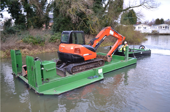 The platform is 17ft 6 in in width (with tanks), making it less manoeuvrable than other platforms. However, remove the tanks, and the pontoon narrows to 13ft 6in wide, allowing it to pass through most wide locks while still supporting machines up to 6.5 tonnes. This allows you to load machinery onto the pontoon and transport it to remote sections of the canal or river network.
