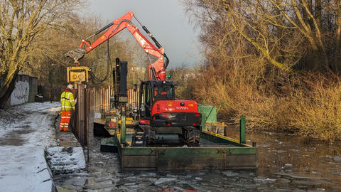 Piling is the process of driving long columns – known as piles – into the ground to support structures or reinforce the banks of waterways. It’s often used to stabilise embankments, prevent erosion, or provide a foundation for moorings, jetties or buildings.
